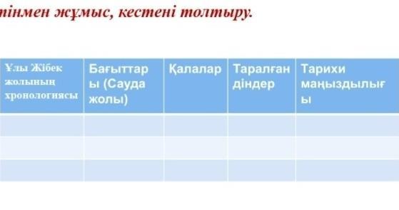 1 тапсырма: тінмен жұмыс, кестені толтыру. Ұлы Жiбек Бағыттар Қалалар таралған Тарихи ы (Сауда жолынын Дiндер маңыздыль хронологиясы жолы)