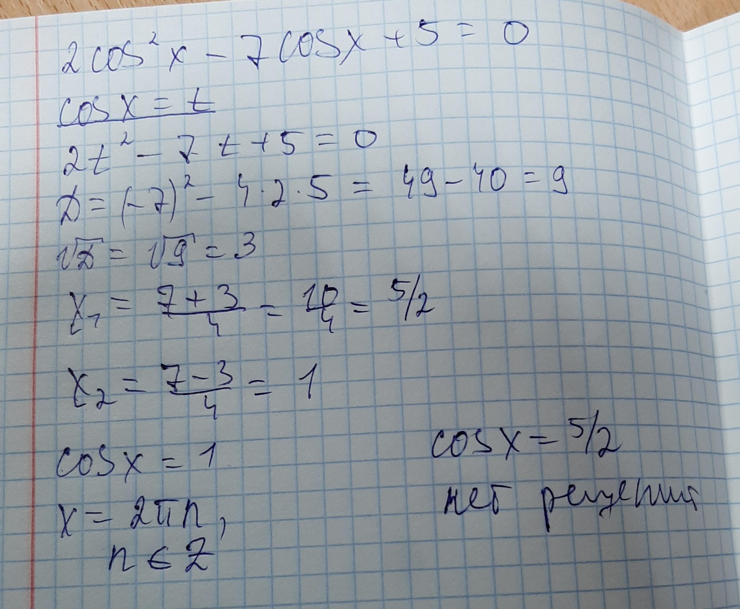 Данное уравнение решается с помощью замены. Заменили сos(x) на переменную t и решили квадратное уравнение. Полученные корни подставили в замену и решили.