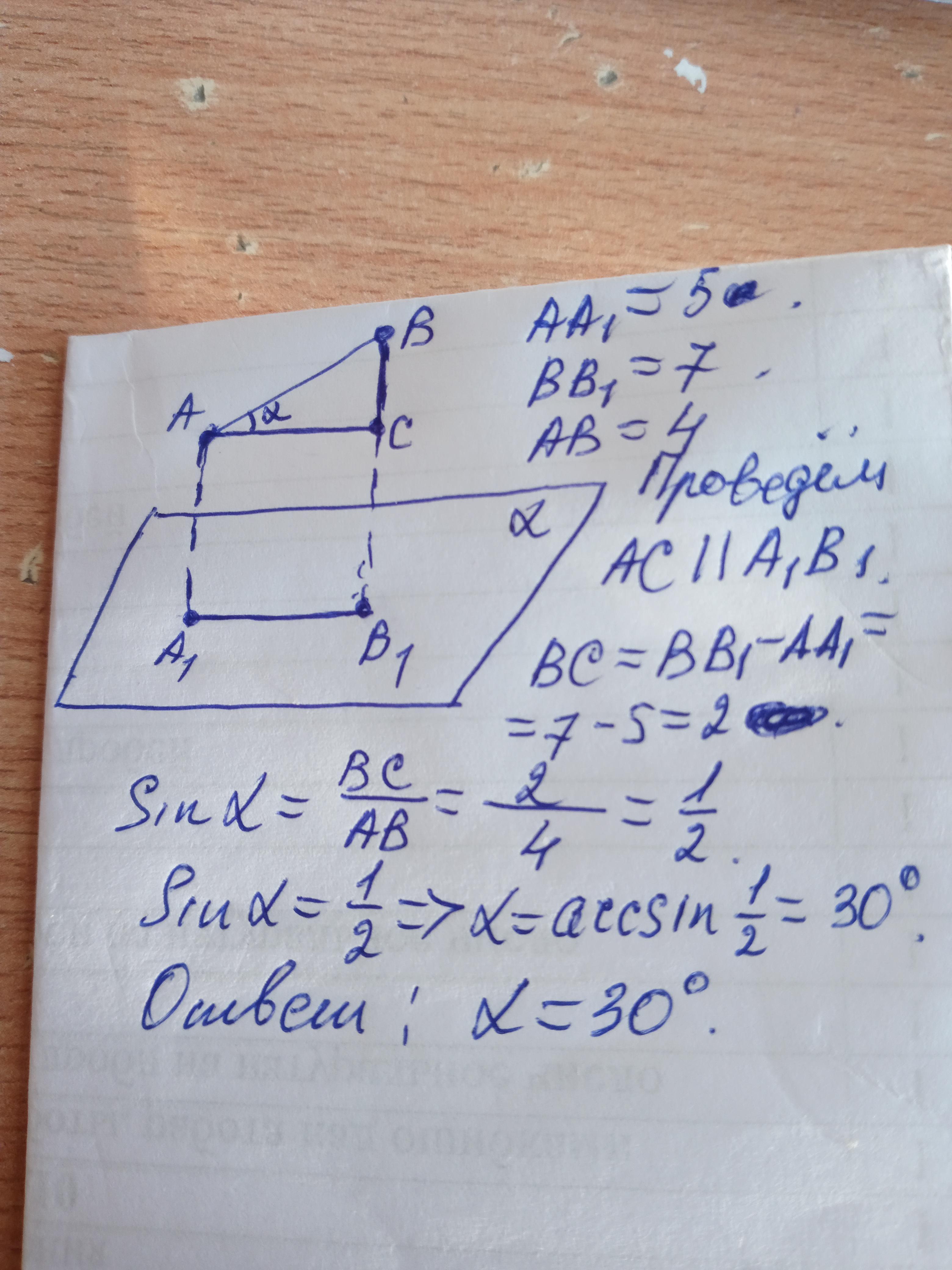 Отмечены точки A и B, лежащие по одну сторону от плоскости α, а расстояния от этих точек до плоскости α соответственно равны 5 и 7. Длина отрезка AB равна 4. Найди значение угла между прямой AB и ее проекцией на плоскости α.