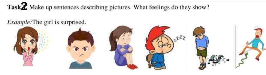 Task 2 Make up sentences describing pictures. What feelings do they show? Example: The girl is surprised.