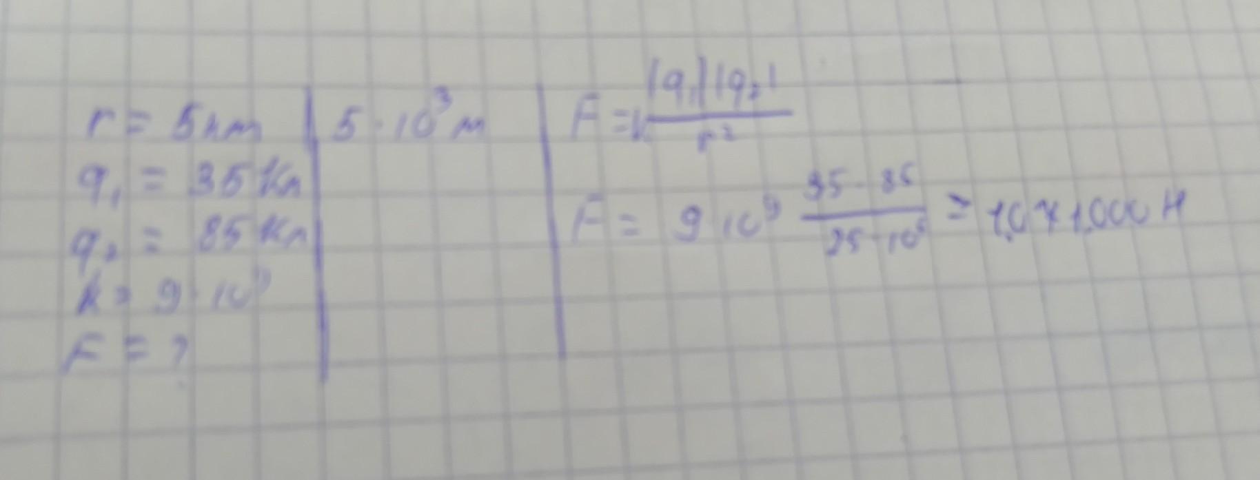 4.Определите силу взаимодействия двух туч, расположенных на расстоянии 5 км друг от друга, если их заряд соответственно равны 35 Кл и 85 Кл.