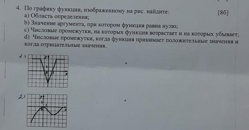 2 По графику функции, изображенному на рис. найдите: а) Область определения; b) Значение аргумента, при котором функция равна нулю; c) Числовые промежутки, на которых функция возрастает и на которых убывает; d) Числовые промежутки, когда функция принимает положительные значения и когда отрицательные значения.