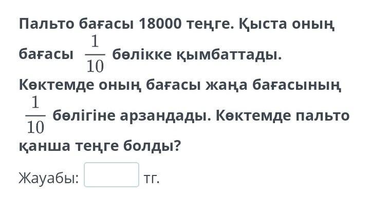 Пальто бағасы 18000 теңге. Қыста оның 1 бағасы 10 бөлікке қымбаттады. Көктемде оның бағасы жаңа бағасының 1 бөлігіне арзандады. Көктемде пальто 10 қанша теңге болды? Жауабы: тг.