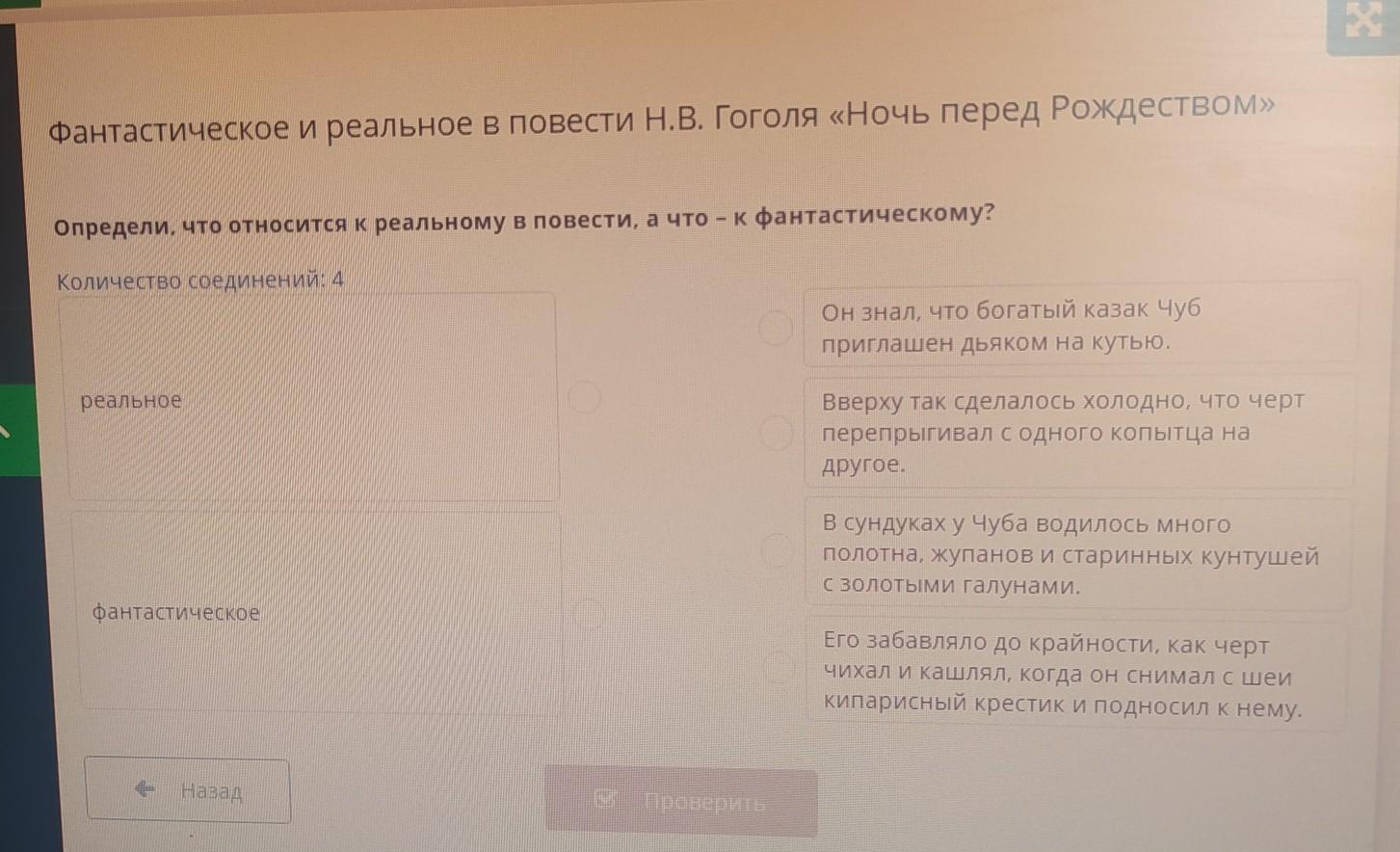 Фантастическое и реальное в повести Н.В. Гоголя «Ночь перед Рождеством» Определи, что относится к реальному в повести, а что-к фантастическому? Количество соединений: 4 реальное фантастическое + Назад Проверить Он знал, что богатый казак Чуб приглашен дьяком на кутью. Вверху так сделалось холодно, что черт перепрыгивал с одного копытца на Другое. В сундукax y Чуба водилось много полотна, жупанов и старинных кунтушей с золотыми галунами. Его забавляло до крайности, как черт чихал и кашлял, когда он снимал с шеи кипарисный крестик и подносил к нему. R д Х СРОЧНО ПОЖАЛУЙСТА