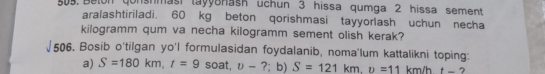 kilogramm dum Va hecha kilogramm sement olish kerak? 506. Bosib o'tilgan yoʻl formulasidan foydalanib, nomaʼlum kattalikni toping: a) S=180 km, t = 9 soat, v - ?; b) S = 121 km, v =11 km/h, t – ?. 507. Bajarilgan ish formulasidan foydalanib, noma'lum kattalikni toping necha