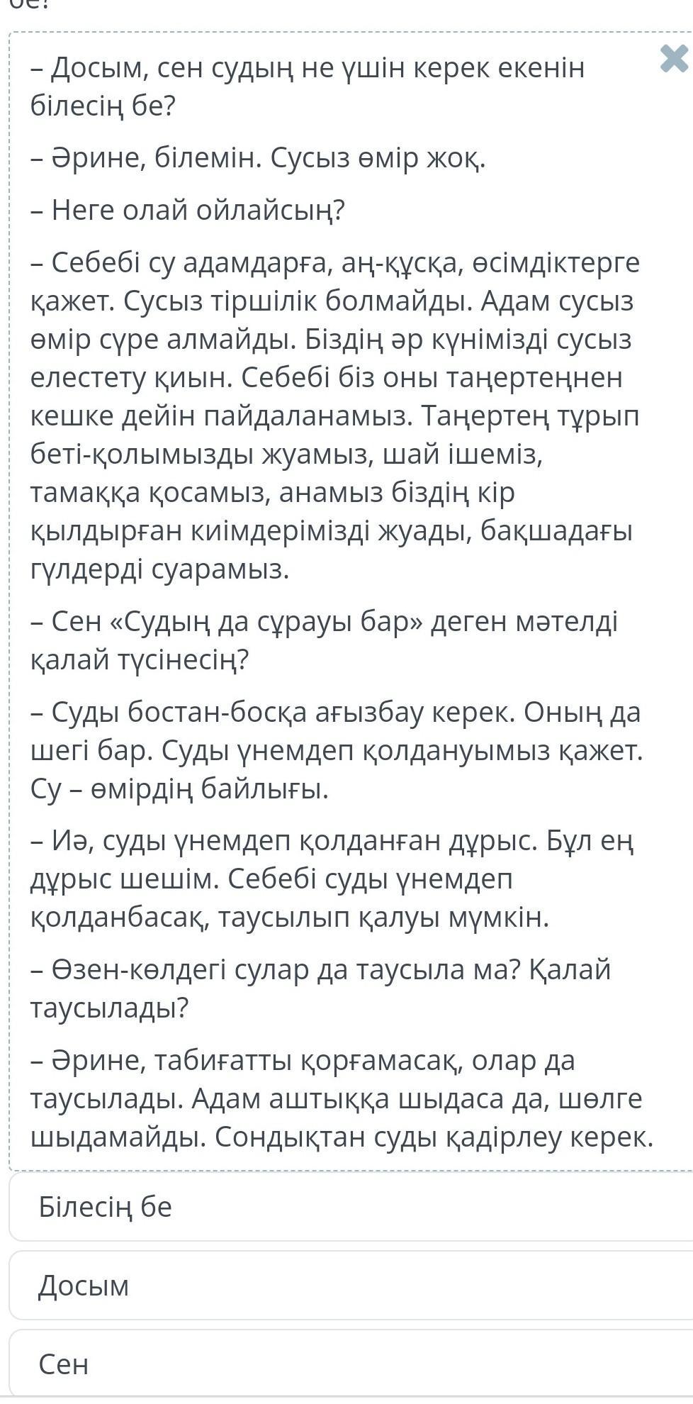 Сөйлемнен есімдікті анықта. - Досым, сен судың не үшін керек екенін білесің бе? - Досым, сен судың не үшін керек екенін Х білесің бе? - Әрине, бiлемiн. Сусыз өмір жоқ. - Неге олай ойлайсың? - Себебі су адамдарға, аң-құсқа, өсімдіктерге қажет. Сусыз тіршілік болмайды. Адам сусыз өмір сүре алмайды. Біздің әр күнімізді сусыз елестету қиын. Себебі біз оны таңертеңнен кешке дейін пайдаланамыз. Таңертең тұрып беті-қолымызды жуамыз, шай ішеміз, тамаққа қосамыз, анамыз біздің кір қылдырған киімдерімізді жуады, бақшадағы гулдерді суарамыз. - Сен «Судың да сұрауы бар» деген мәтелді калай түсінесің? Суды бостан-босқа ағызбау керек. Оның да шегі бар. Суды үнемдеп қолдануымыз қажет. Су - өмірдің байлығы. – Иә, суды үнемдеп қолданған дұрыс. Бұл ең дұрыс шешім. Себебі суды үнемдеп қолданбасақ, таусылып қалуы мүмкін. – Өзен-көлдегі сулар да таусыла ма? Қалай таусылады? – Әрине, табиғатты қорғамасақ, олар да таусылады. Адам аштыққа шыдаса да, шөлге шыдамайды. Сондықтан суды қадірлеу керек. Білесің бе Досым Сен