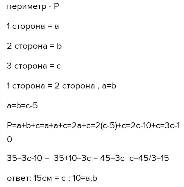Срочно!!! Периметр рівнобедреного трикутника дорівнює 35 см, а його основа менша від бічної сторони на 5 см. Знайдіть сторони цього трикутника.