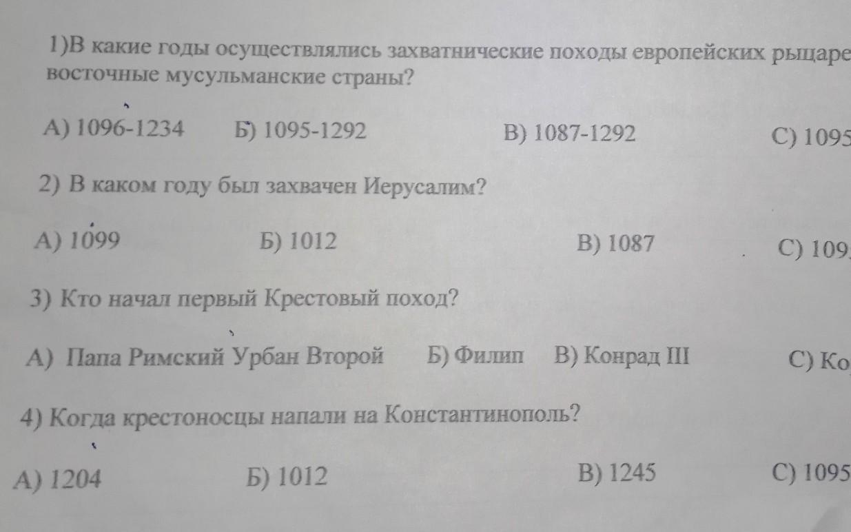 2. Тест 1)В какие годы осуществлялись захватнические походы европейских рыцарей на восточные мусульманские страны? A) 1096-1234 5) 1095-1292 2) В каком году был захвачен Иерусалим? А) 1099 Б) 1012 3) Кто начал первый Крестовый поход? А) Папа Римский Урбан Второй Б) Филип 4) Когда крестоносцы напали на Константинополь? A) 1204 Б) 1012 3. Ответьте на вопросы. на крестового похода B) 1087-1292 B) 1087 В) Конрад III B) 1245 C) 1095-1299 C) 1095 С) Король Ричард C) 1095