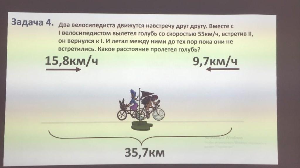 Задача 4. Два велосипедиста движутся навстречу друг другу. Вместе с I велосипедистом вылетел голубь со скоростью 55км/ч, встретив II, он вернулся к I. И летал между ними до тех пор пока они не встретились. Какое расстояние пролетел голубь? 15,8км/ч 9,7км/ч 35,7км