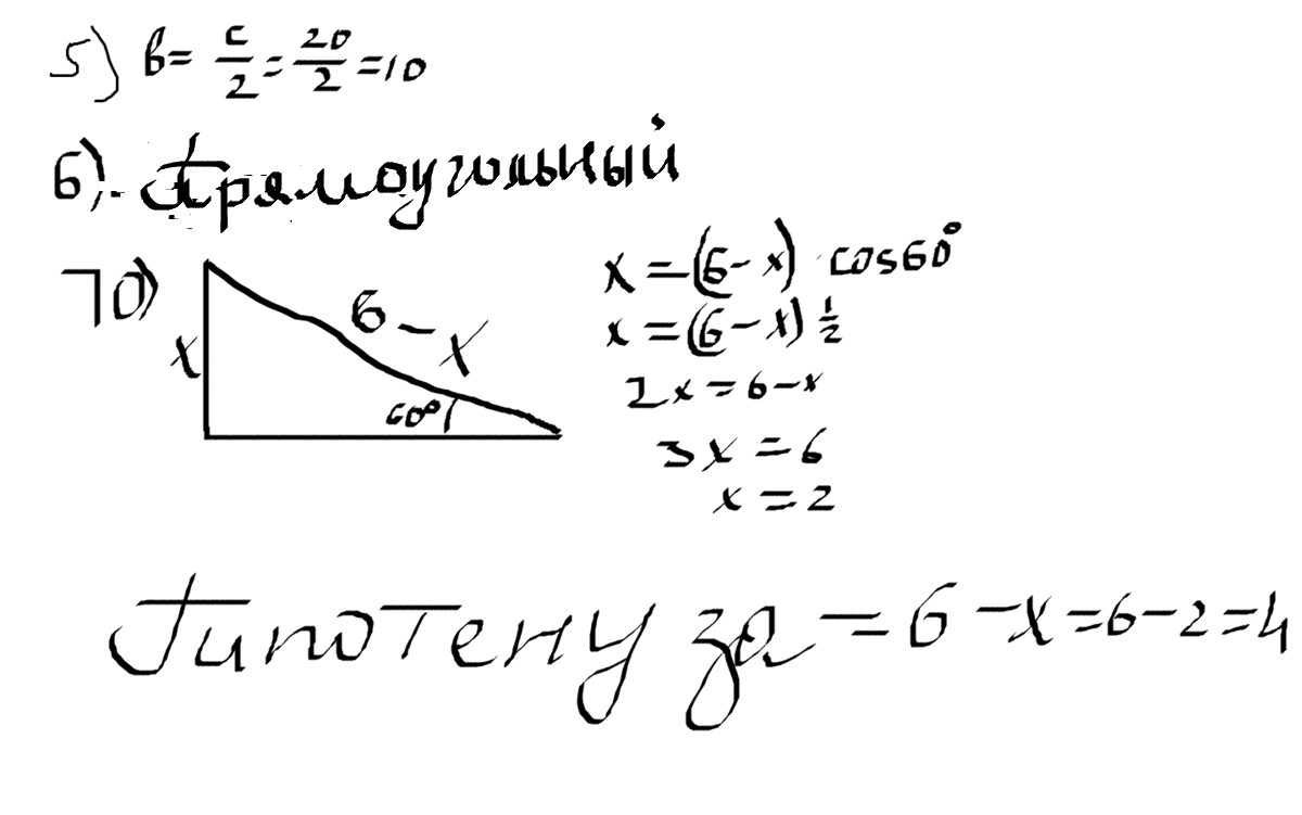 5) Длина катета(наименьший) находящегося напротив угла 30 градусов в 2 раза меньше гипотенузы. Ответ 10см
