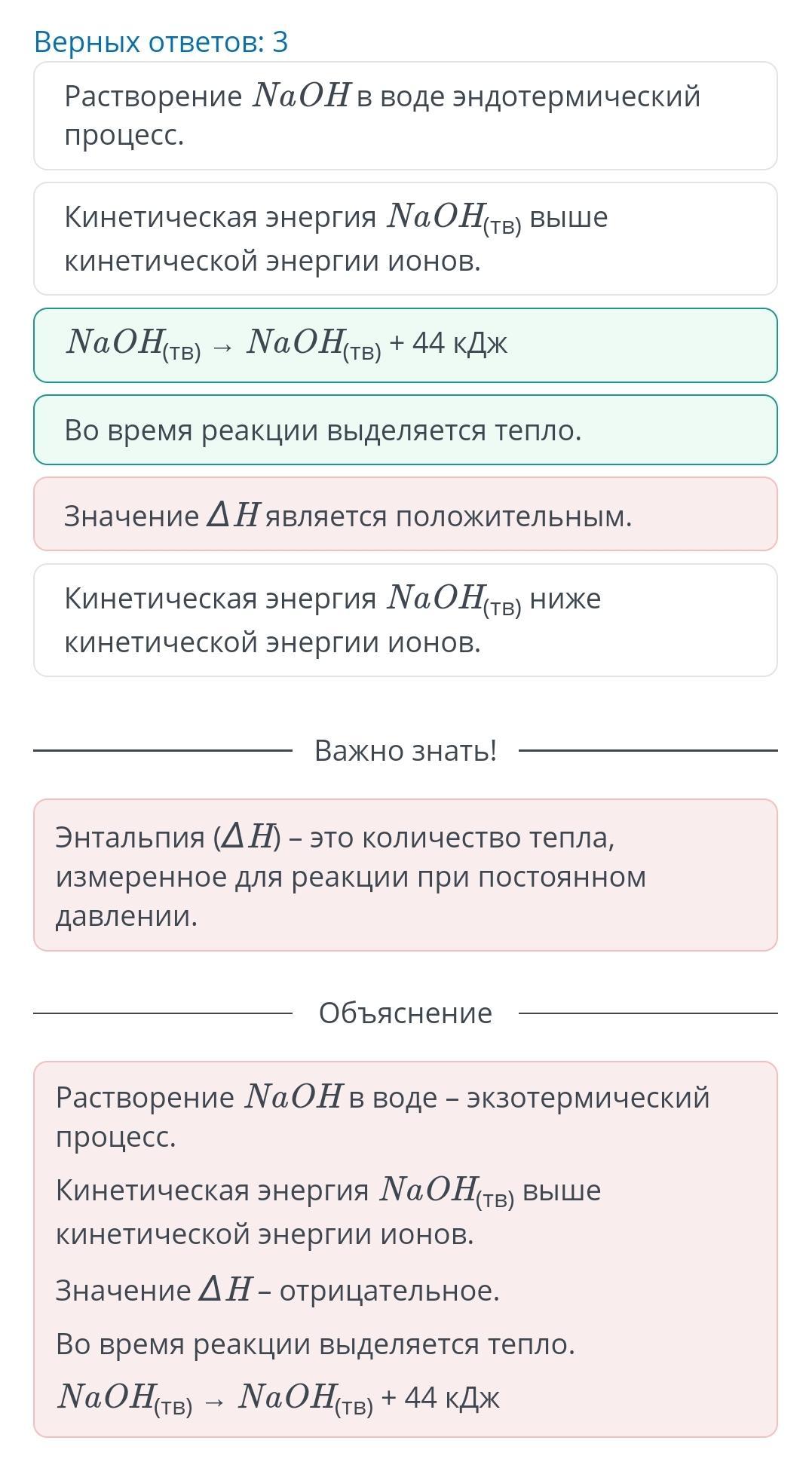 Уравнение процесса растворения небольшого количества NaOH(TB)→ Na (BOAH) + OH + OH (водн) (водн В ходе реакции измерили изменение температуры. Начальная температура воды = 19,0ºС Конечная температура полученного раствора = 27,0°С Выбери правильные утверждения для этих изменений. Верных ответов: 3 Значение Д Н является положительным. Растворение NaOH в воде эндотермический процесс. Во время реакции выделяется тепло. + Назад Кинетическая энергия NaOH) BE (TB) кинетической энергии ионов. Кинетическая энергия н кинетической энергии ионов. Чтв) NaOH ) - NaOH T) + 44 кДж (TB)