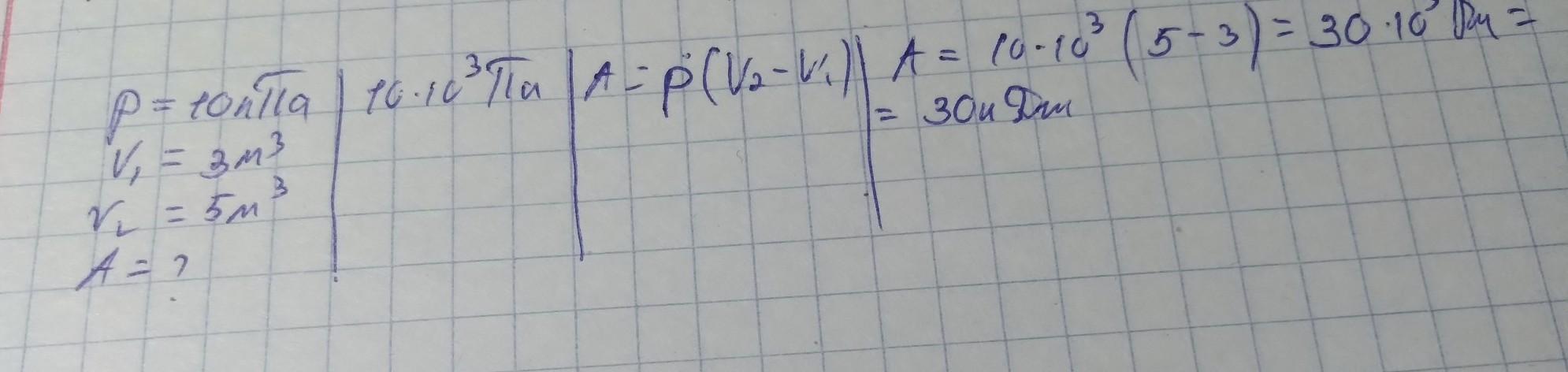 [1] 4. Объём газа, находящегося под давлением 10 кПа, изобарно возрос от 3 до 5 м3. Определите работу. совершённую газом при расширении.
