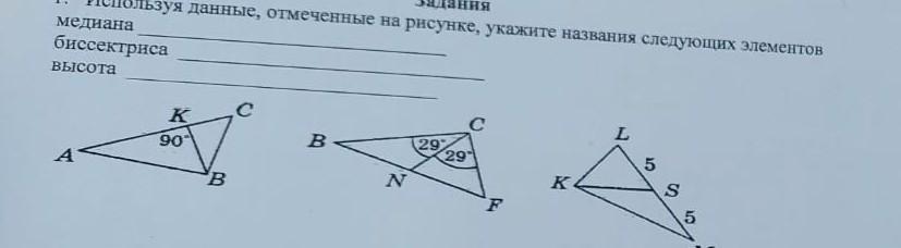 Используя данные, отмечены на рисунке, укажите названия следующих элементов медиана биссектриса высота