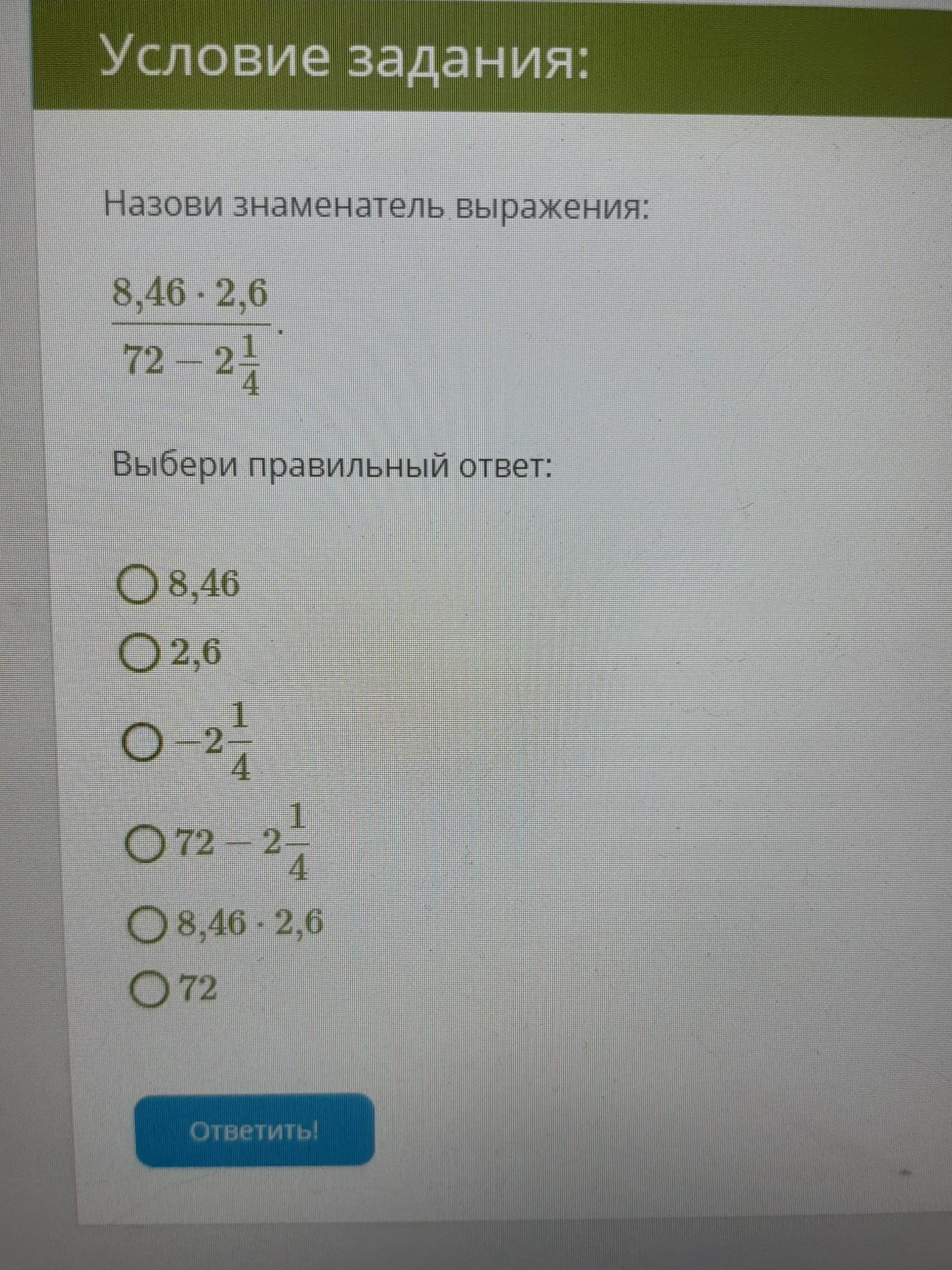 Знаменатель - это нижняя часть дроби, поэтому правильный ответ : 72 - 2 1/4