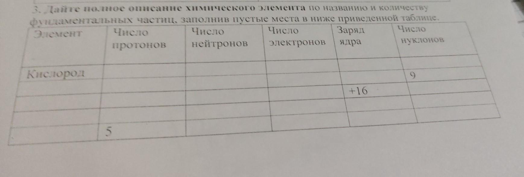 Дайте полное описание химического элемента по названию и количеству фундаментальных частиц, заполнив пустые места в ниже приведенной таблице.