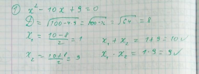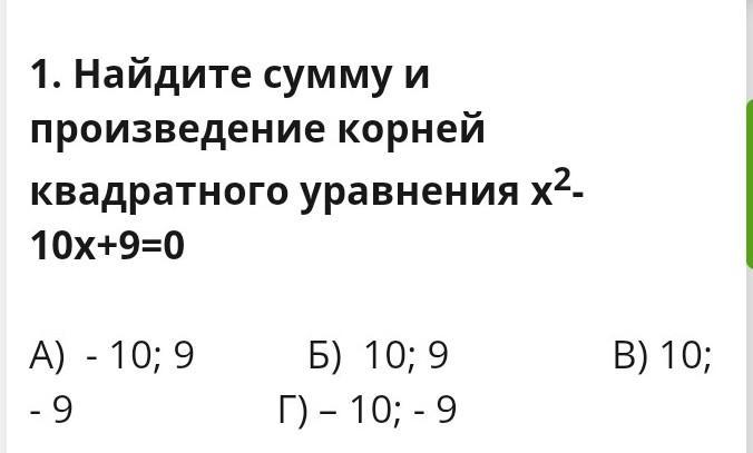 1. Найдите сумму и произведение корней квадратного уравнения x2- 10x+9=0 A) - 10; 9 - 9 Б) 10; 9 r) - 10; -9 B) 10;
