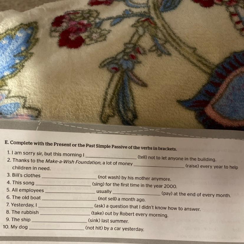 1 was told 2 is raised 3 aren't washed 4 was sung 5 are usually paid 6 was not sold 7 was asked 8 is taken 9 was sunk 10 was not hit