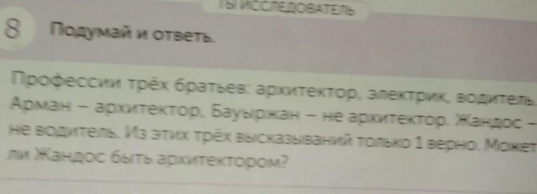 8 Подумай и ответь Профессии трех братьев архитектор, электр водитель Арман - архитектор, Бауыржан - не архитектор, Жандос - не водитель. Из этих трех высказываний только 1 верно. Может Жандос быть архитектором?