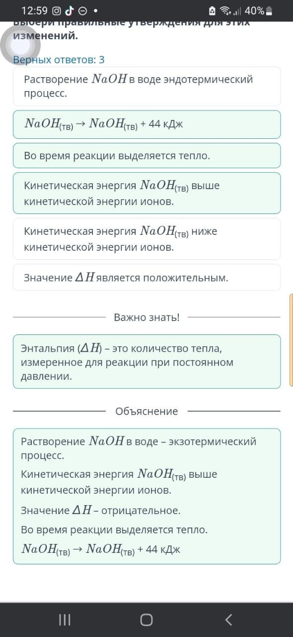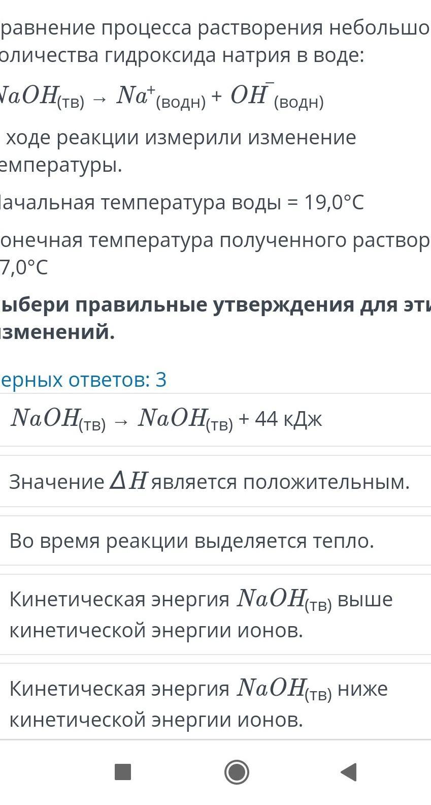 Уравнение процесса растворения небольшого количества гидроксида натрия в воде: NaOH(тв) → Nat(водн) + ОН + ОН (водн) В ходе реакции измерили изменение температуры. Начальная температура воды = 19,0°С Конечная температура полученного раствора = 27,0°C Выбери правильные утверждения для этих изменений.