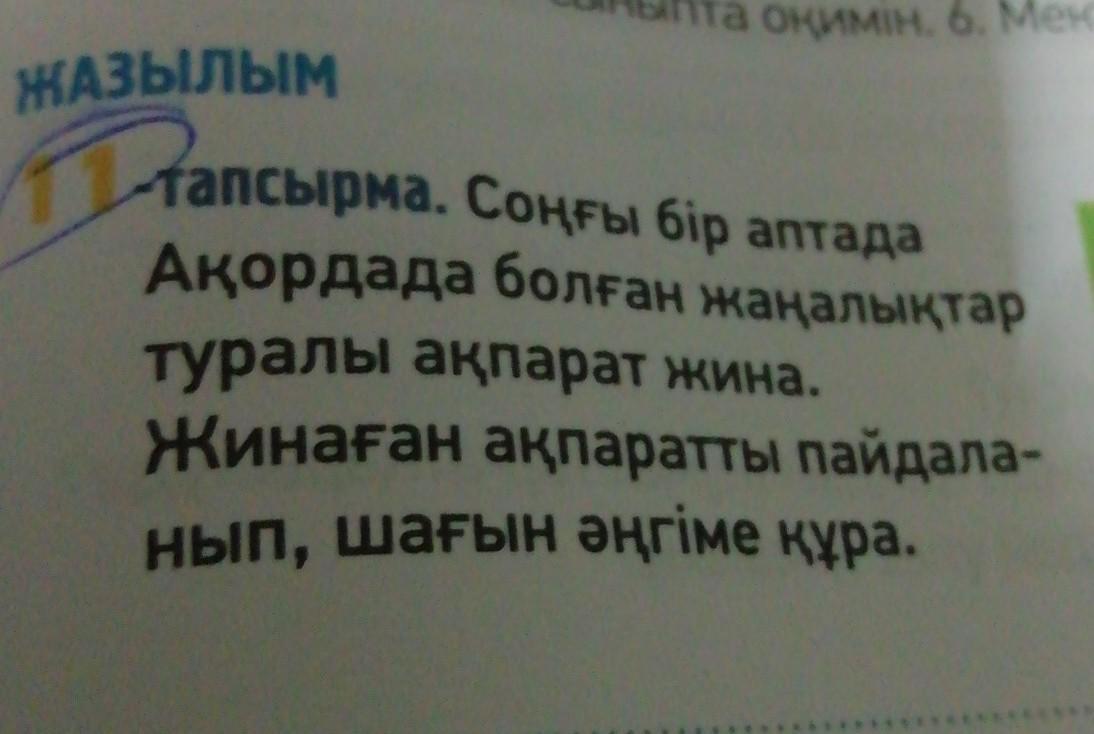 Соңғы бір аптада Акордада болған жаңалықтар туралы ақпарат жина. Жинаған ақпаратты пайдала- нып, шағын әңгіме құра.