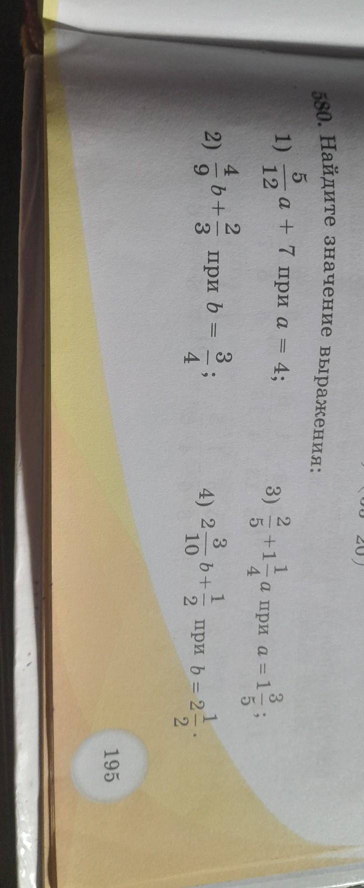 580. Найдите значение выражения: 5 1) а + 7 при а = 4; = 12 2) b+ 3 при b = 3 4 (55 20). 3) cT/N 5 4) 2-3 10 A/H 3 а при а = 1-; 5 1 при ь = 2- 12 195