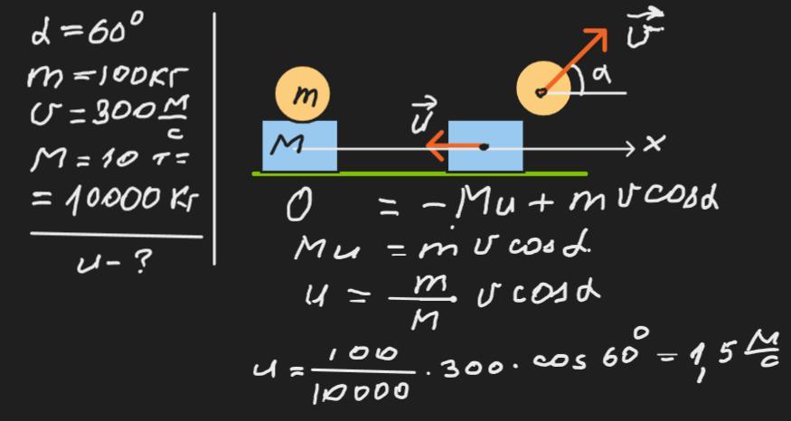 Гармата, що стоїть на гладкій горизонтальній поверхні, стріляє під кутом 600 до горизонту. Маса снаряда 100кг, його швидкість при вильоті із гармати 300м/с. З якою швидкістю почне відкочуватись гармата після пострілу, якщо її маса 10т?