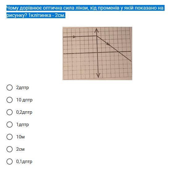 Чому дорівнює оптична сила лінзи, хід променів у якій показано на рисунку? 1клітинка - 2см.