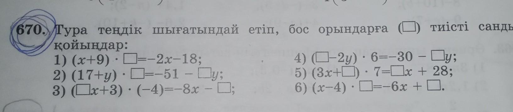 N 670 Тура теңдік шығатындай етіп, бос орындарға (□) тиісті санды қойыңдар