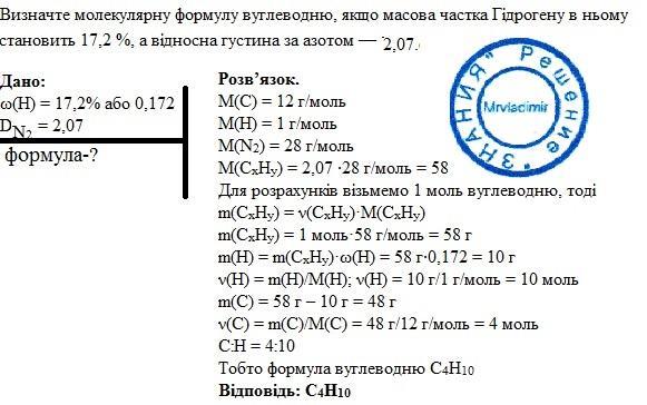 Визначте молекулярну формулу вуглеводню, якщо масова частка Гідрогену в ньому становить 17,2 %, а відносна густина за азотом — 2,07.(C4H10)