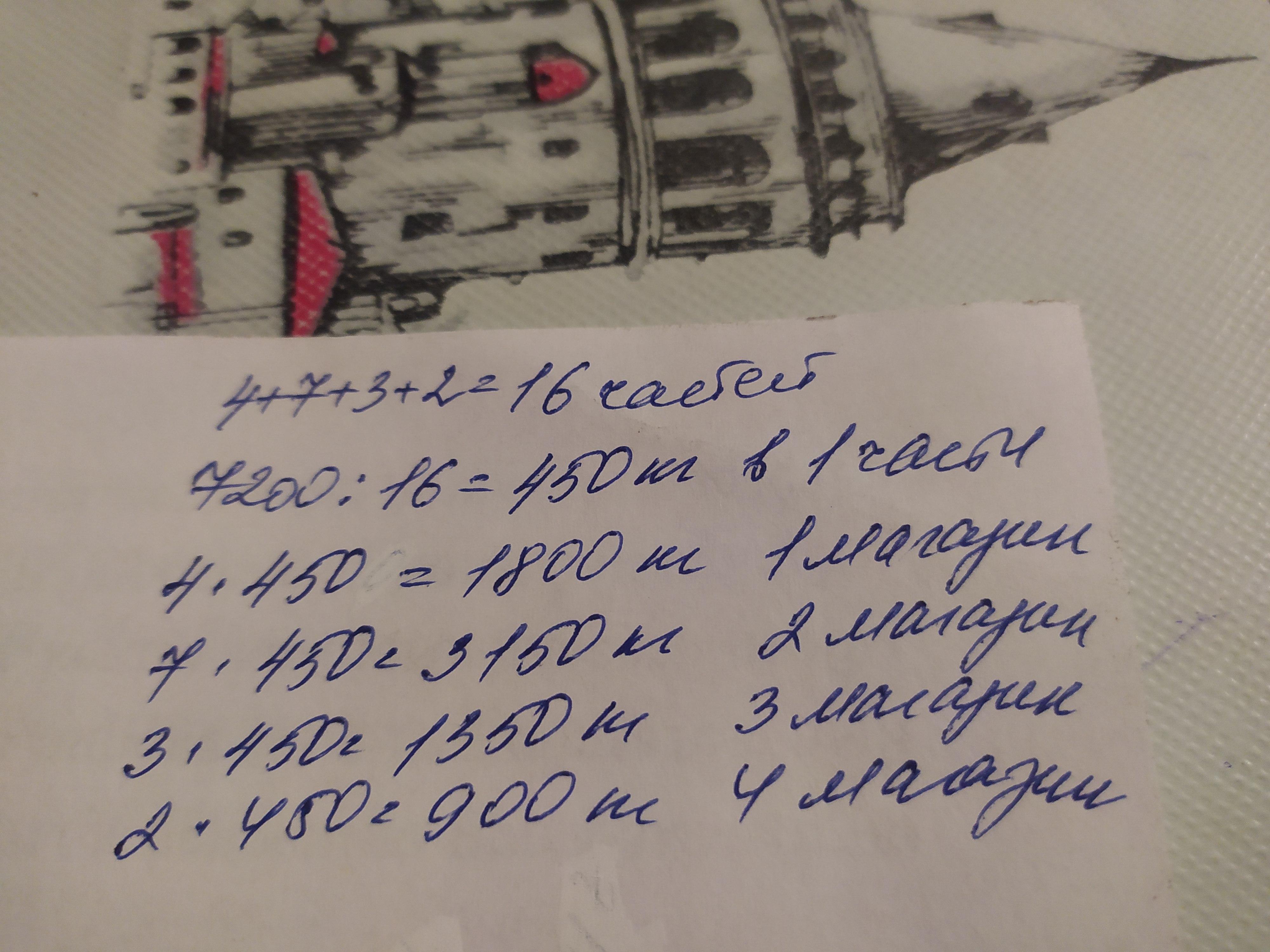7200 кг борошна завезли у чотири магазини у відношенні 4:7:3:2. Визнач скільки кілограмів борошна завезли у кожний магазин.