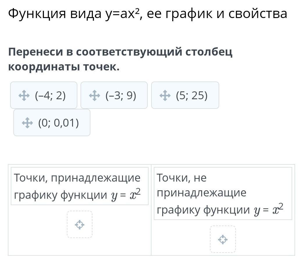 Функция вида y=ax², ее график и свойства Перенеси в соответствующий столбец координаты + (-4; 2) + (0; 0,01) точек. +(-3; 9) + (5; 25) Точки, принадлежащие Точки, не графику функции y=x² принадлежащие графику функции у = x²