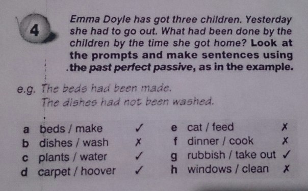 the plants had been watered. the carpet had not been hoovered. the cat had not been feed. the dinner had not been cooked. the rubbish had been taken out. the windows had not been cleaned