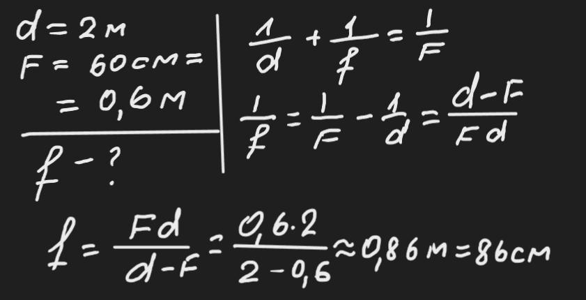 Вiдстань від предмета до збиральноï лінзи дорівнює 2 м. Визначте відстань вiд лiнзи до зображення, якщо фокусна відстань лінзи 60 см.