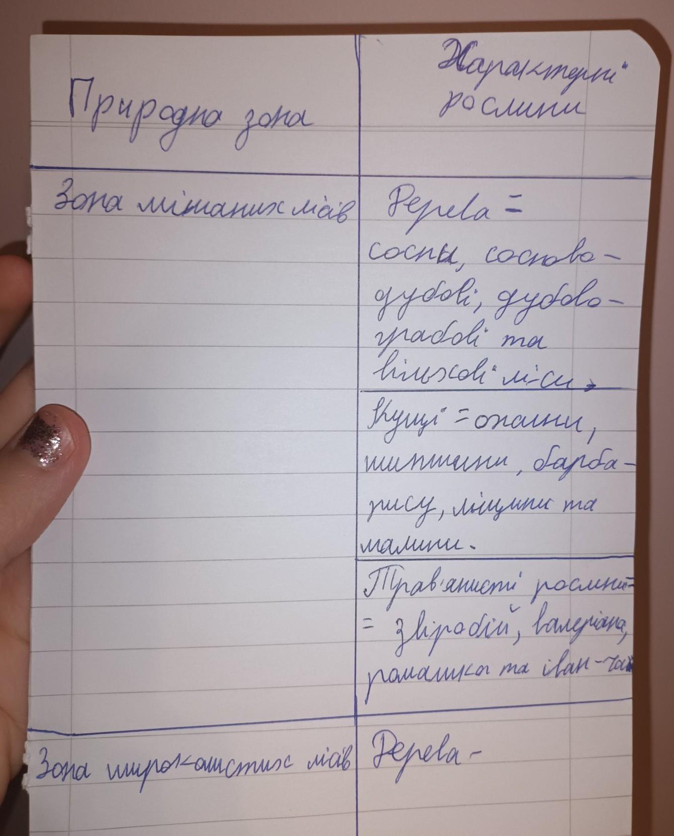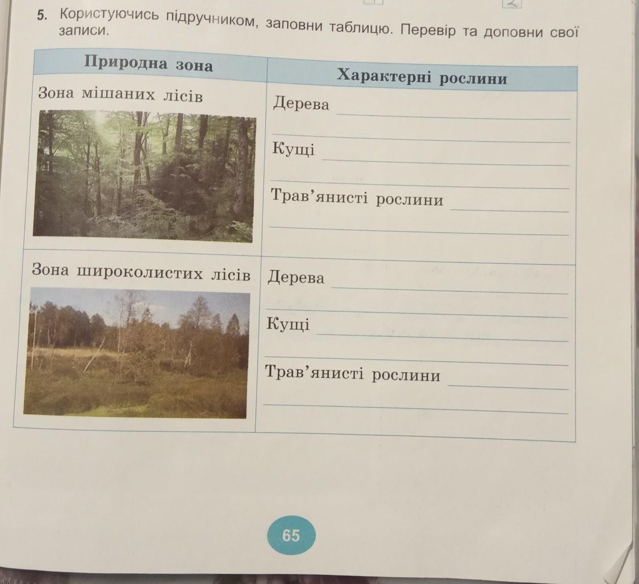 5. Користуючись підручником, заповни таблицю. Перевір та доповни свої записи Характерні рослини Природна зона Зона мішаних лісів Дерева Кущі Трав'янисті рослини Зона широколистих лісів Дерева Кущі Трав'янисті рослини
