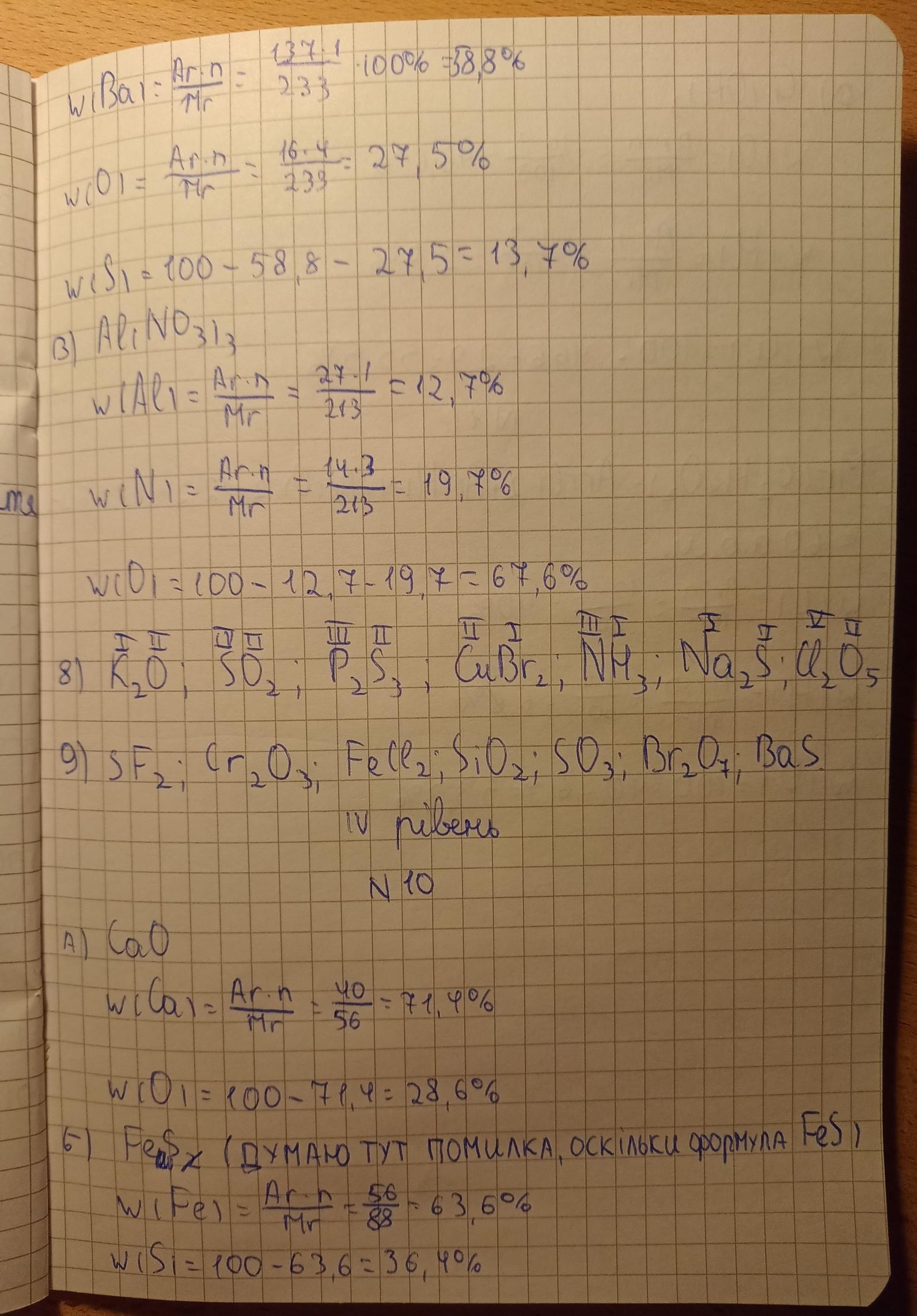 10. Обчисліть масові частки всіх елементів в таких сполуках: CaO; FeS2; Cr(OH)3.