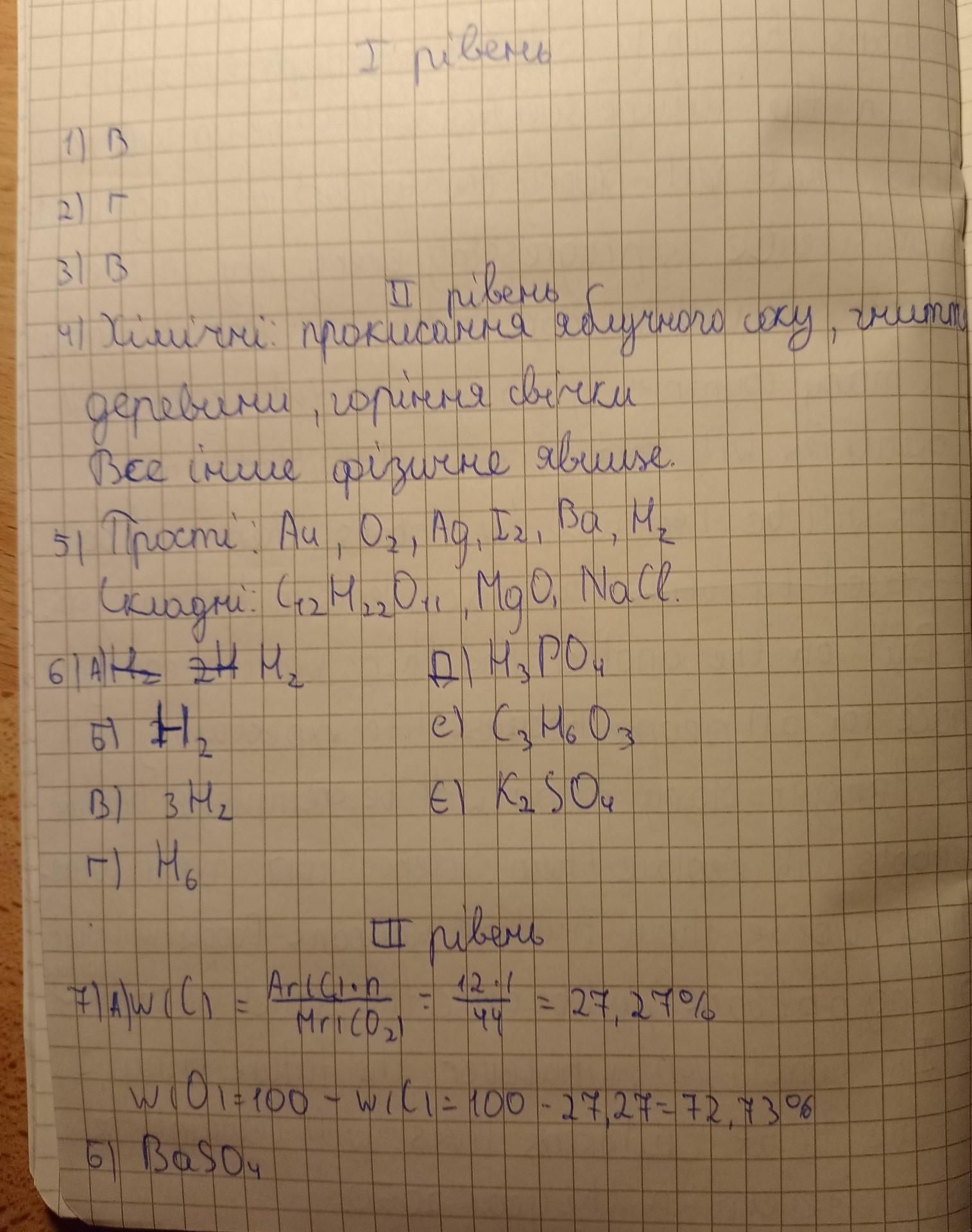 5. Із наведеного переліку випишіть окремо прості речовини (метали і неметали) та складні речовини: золото Au, цукор C12H22O11, кисень O2, магній оксид MgO, срібло Ag, йод I2, барій Ba, водень H2, кухонна сіль NaCl.