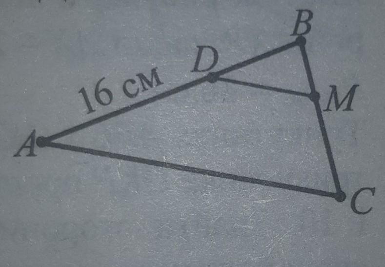 Трикутник ABC подібний до трикутника DBM. За рисунком знайти довжину сторони DB, якщо AD = 16 см, периметр трикутника DBM дорівнює 18 см а периметр трикутника ABC дорівнює 54 см