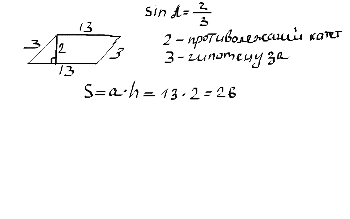 стороны параллелограмма равны 3 и 13 а синус одного из углов параллелограмма равен 2/3. найдите площадь параллелограмма