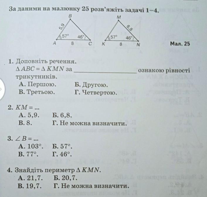 1)Друга ознака: якщо пряма, і два прилеглих кути рівні, то і трикутники рівні.