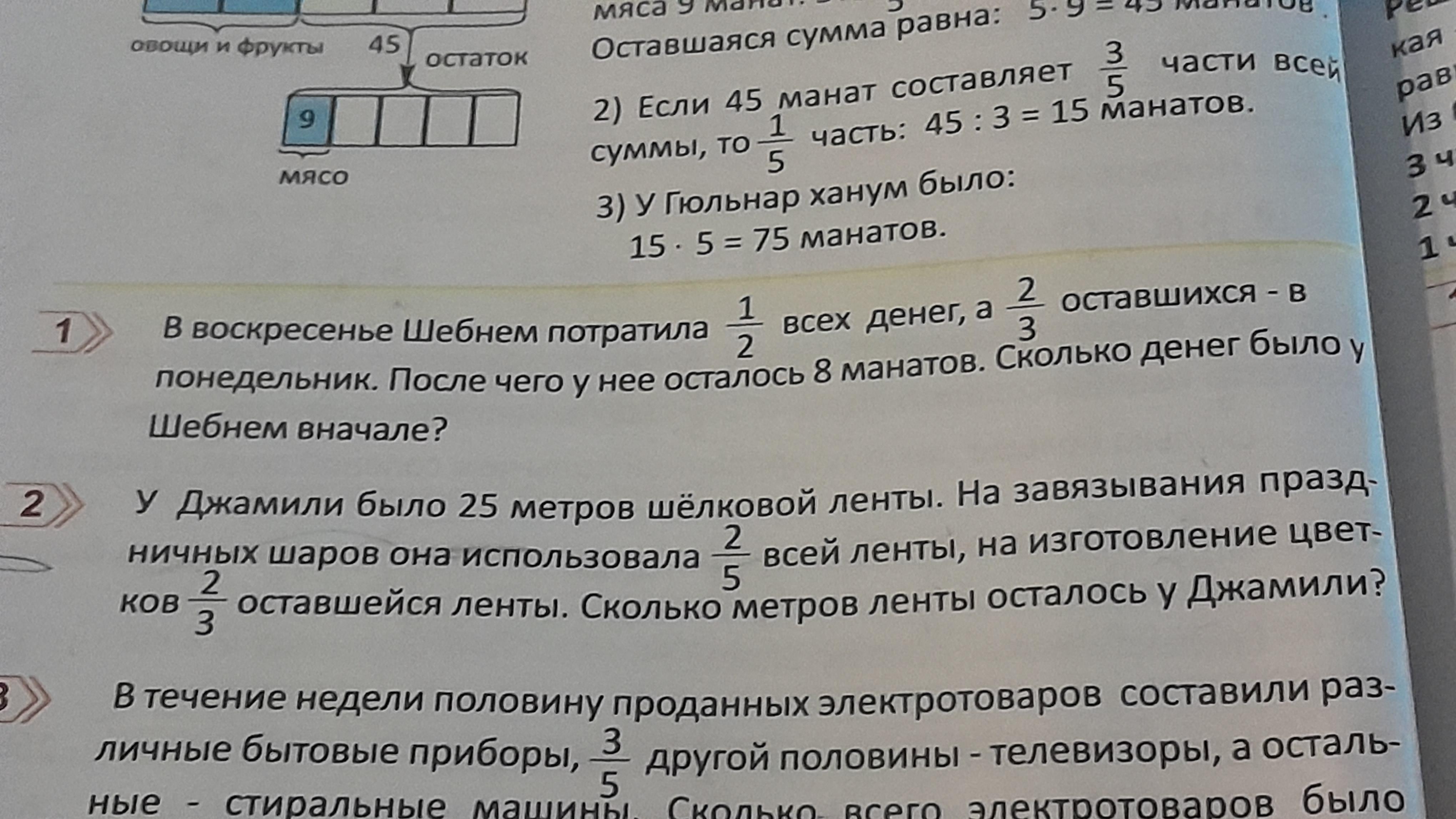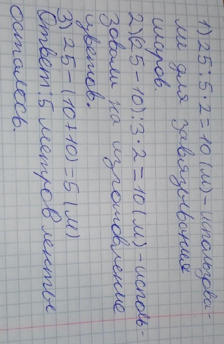 У джамиля было 25 метров шёлковой ленты . На завязывание праздничных шаров она использовала, 2/5 всей ленты,на изготовление цветков 2/3 оставшейся ленты. Сколько метров ленты осталось у Джамиля