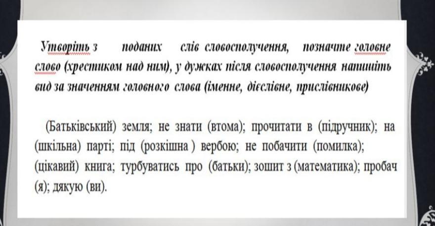 Відповідь:Батьківська земля(прислівникове), не знати втому(дієслівне), прочитати в підручнику(дієслівне), на шкільній парті(прислівникове),під розкішною вербою(іменикове), не побачивши помилку(дієслівне), цікава книга(прислівникове), турбуватися про батьків(дієслівне), зошит з математики(іменникове), пробач мене(дієслівне), дякую вам(дієслівне)