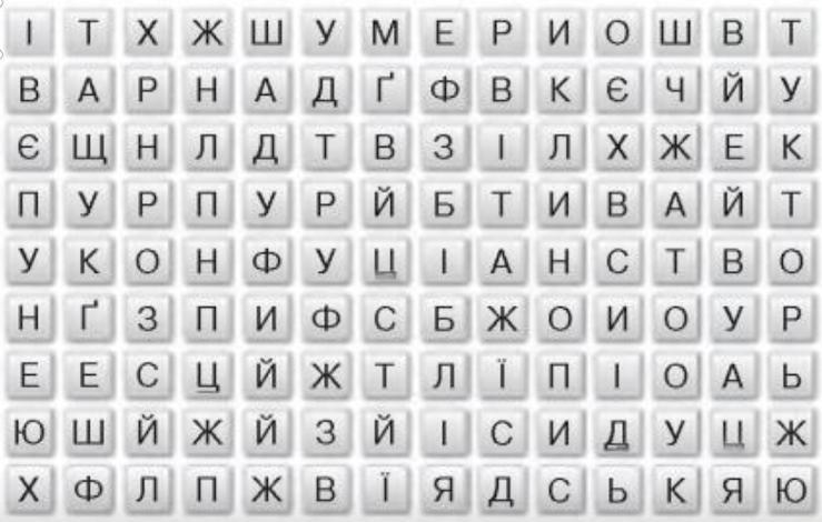 Віднайдіть на полі літер слова з історії стародавніх цивілізацій Африки та Азії. Поясніть їхнє значення й укажіть, до історії якої держави вони належать.