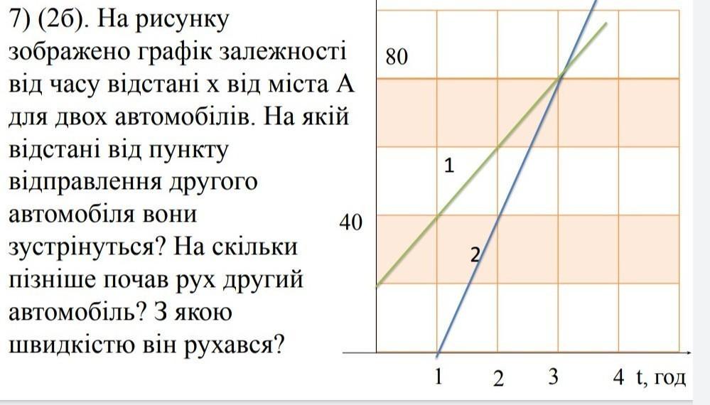 7)На рисунку зображено графік залежності від часу відстані х від міста А для двох автомобілів. На якій відстані від пункту відправлення другого автомобіля вони зустрінуться? На скільки пізніше почав рух другий автомобіль? З якою швидкістю він рухався?