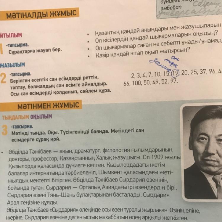 выпишите из текста сан есым и задайте к нему вопросы (к сан есым) первое предложение разбор. помогите пожалуйста