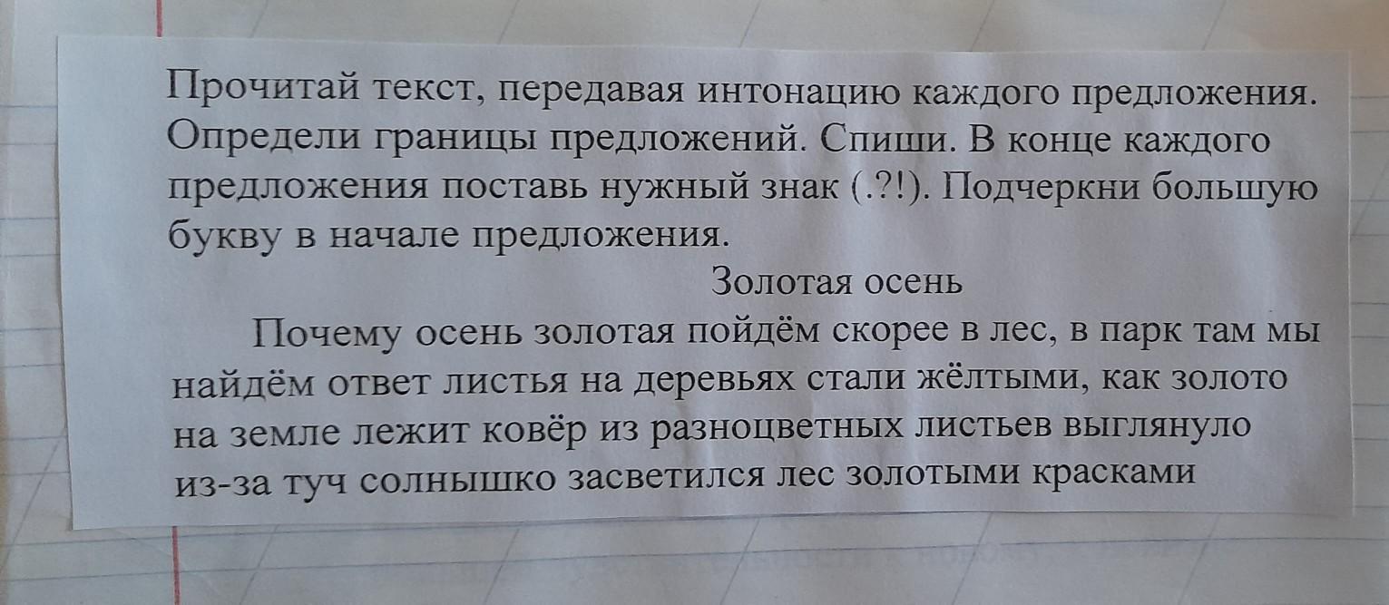 Почему осень золотая? Пойдём скорее в лес! В парк там найдём ответ. Листья на деревьях стали жёлтыми, как золото. На земле лежит ковёр из разноцветных листьев. Выглянул из за туч солнышко. Засветил лес золотыми красками.
