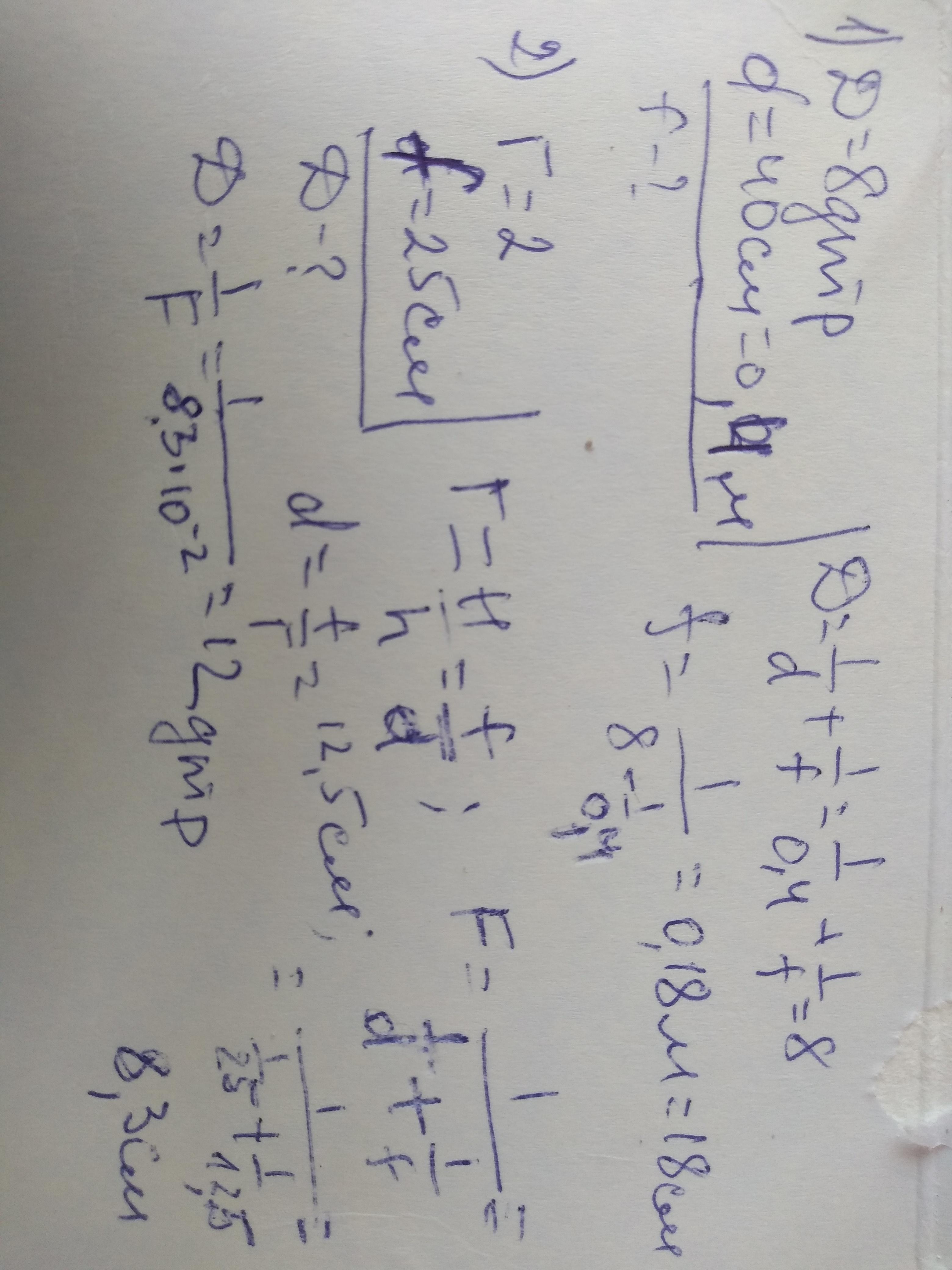 1) Визначити відстань від лінзи до зображення, якщо оптична сила лінзи 8 дптр, а відстань від лінзи до предмета - 40 см.