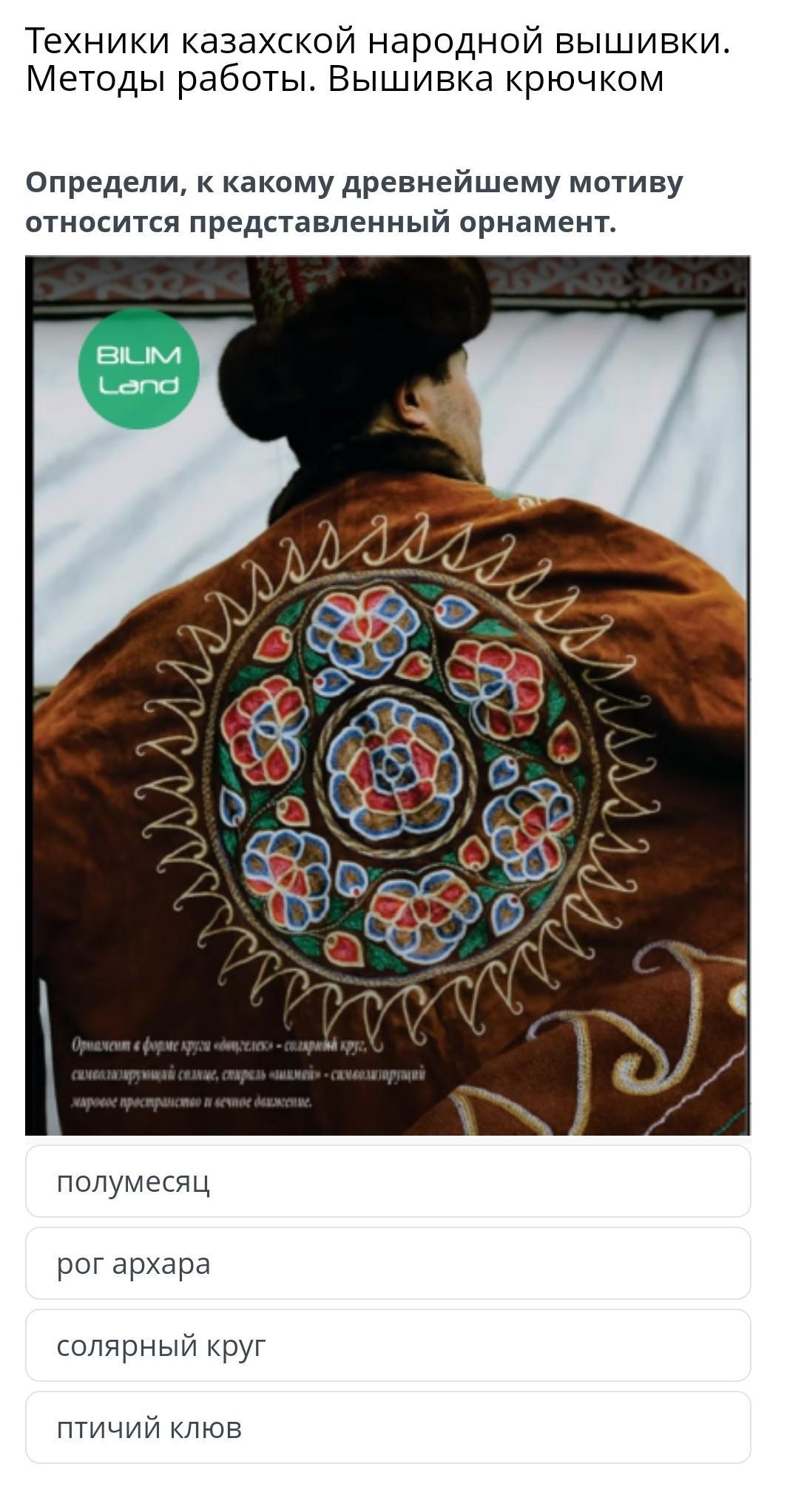 Определи, к какому древнейшему мотиву относится представленный орнамент. пове тог Орнамент в форме круга «доцгелек» - солярий круг, символизирующий солнце, спираль шимой - само зару мировое пространство и вечное движение. полумесяц рог