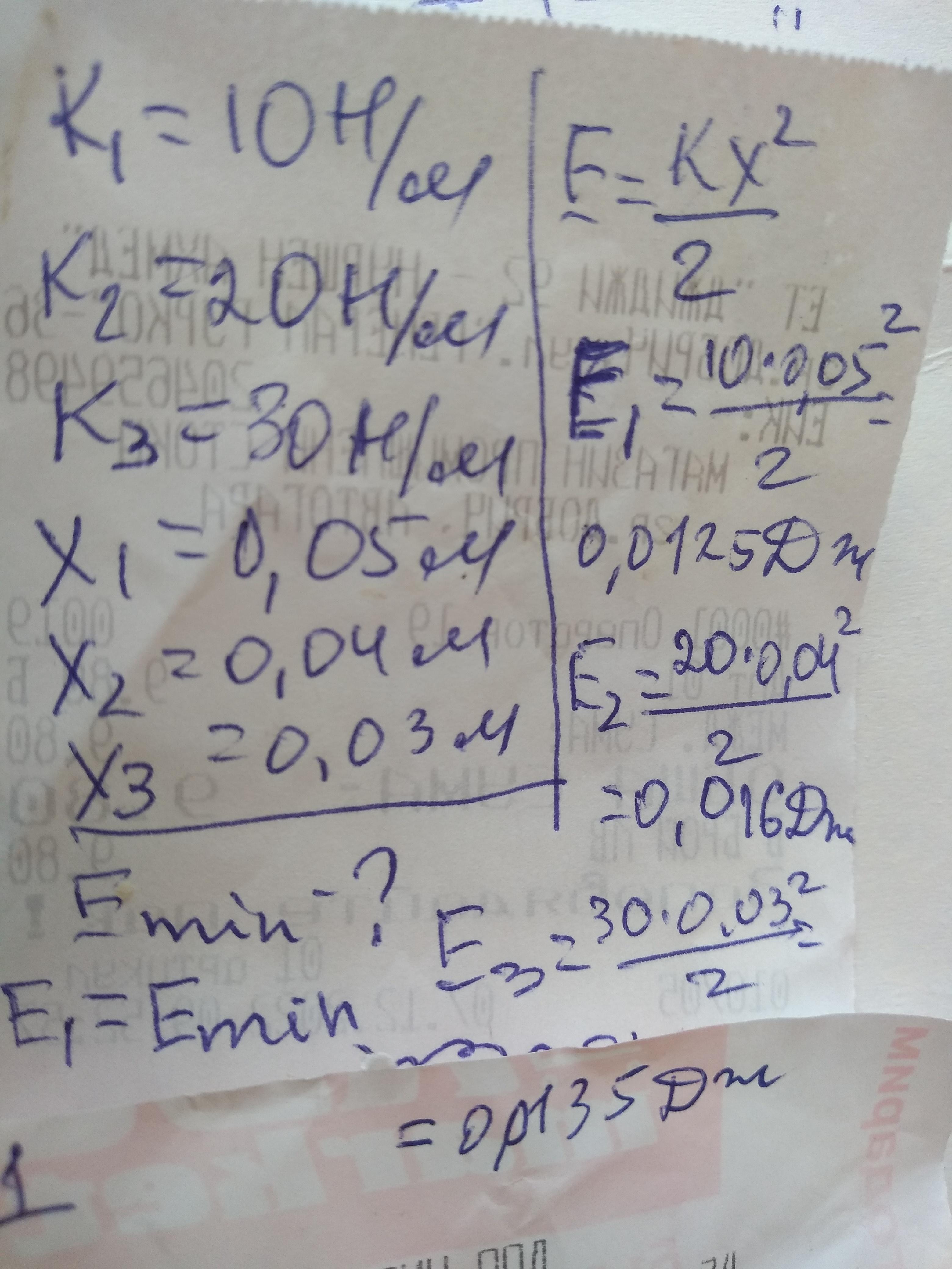 Три пружини жорсткістю 10 Н/м, 20 Н/м і 30 Н/м розтягнули на 5см, 4 см і 3 см відповідно. Визначити у якої пружини потенціальна енергія буде найменшою.