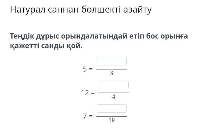 Натурал саннан бөлшекті азайту Теңдік дұрыс орындалатындай етiп бос орынға қажетті санды қой. 5 = 12= 7: = 3 4 19