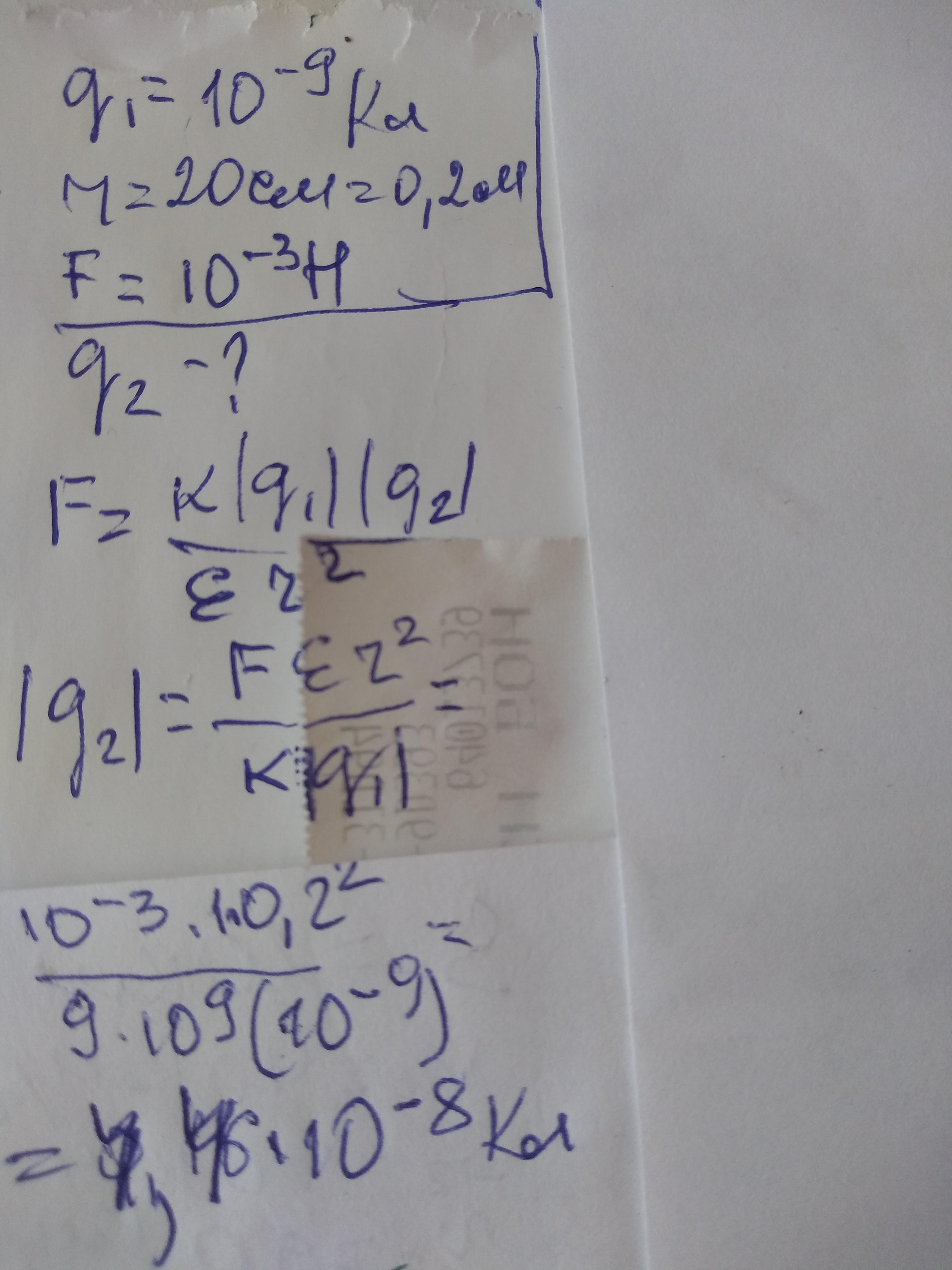 Определите величину одного из зарядов, если известно, что заряд в 10^-9 Кл, находясь на расстоянии 20 см от другого, действует на него с силой равной 10^-3 Н.